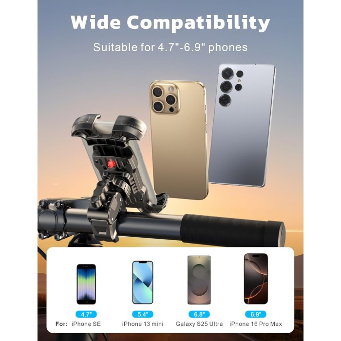- [Fits Most Phones & Bikes] Developed for maximum flexibility, our universal motorcycle phone mount fits almost any phone (4.7"-6.9" with cases) and most handlebars (18-39mm) seamlessly. Ideal for bikes, motorcycles, e-scooters, or even gym equipment, it is compatible with iPhone 17 Pro Max/16/15/14/13/12/11/XS/XR/SE, Galaxy S25 Ultra/S24/S23/S22/S21/S20, LG, and more.