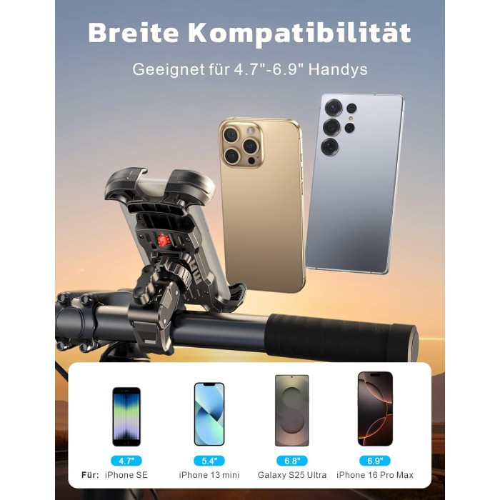 - [Universelle Kompatibilität] Der Handyhalter Fahrrad ist für Vielseitigkeit konzipiert und passt zu einer Vielzahl von Geräten und Lenkerdurchmessern. Er eignet sich für Telefone von 4.7" bis 6.9" (einschließlich Hüllen) und Lenker mit einem Durchmesser von 18-39mm. Egal, ob Sie Fahrrad, Motorrad, Roller, Kinderwagen, Laufbänder und mehr, er ist kompatibel mit iPhone 17 Pro Max/16/15/14/13/12/11/XS/XR/SE, Galaxy S25 Ultra/S24/S23/S22/S21/S20, LG und anderen Mobiltelefonen – wir haben alles im Griff!