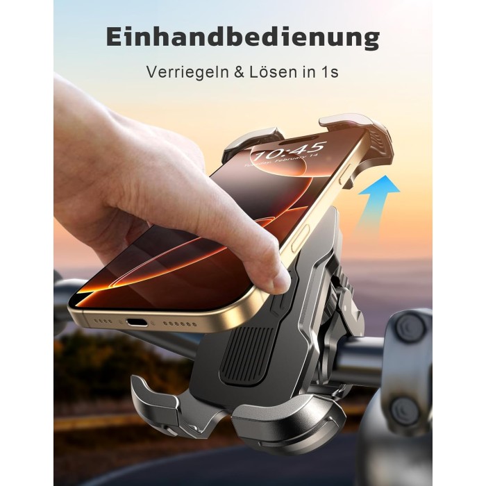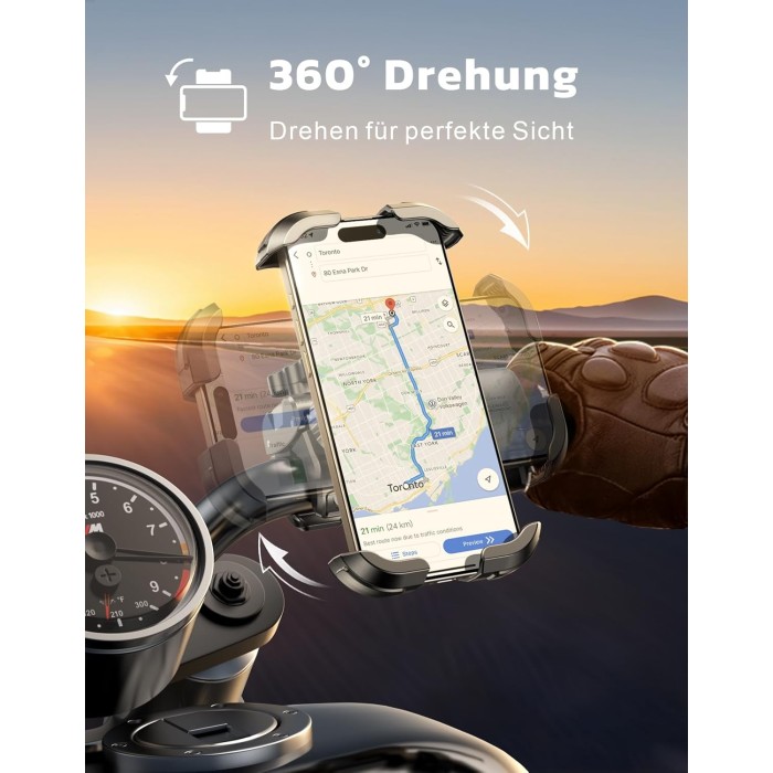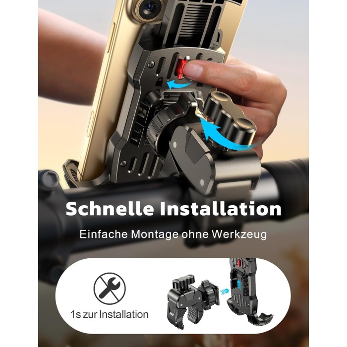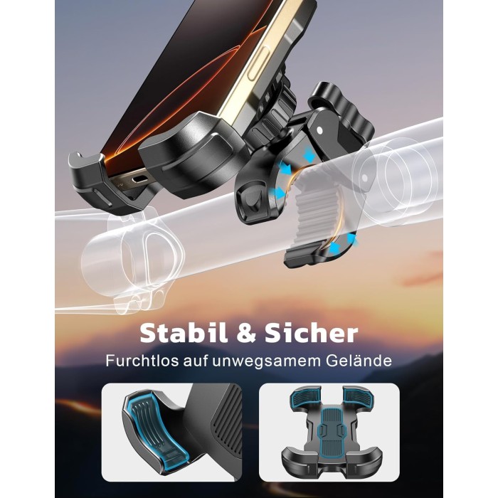 - [Optimierte Sicherheit] Wir wissen, wie wichtig es ist, Ihr Telefon sicher zu halten, besonders auf unebenem Gelände. Deshalb ist unser Motorrad Handyhalterung mit einer verstärkten Basis und vier Silikongriffen ausgestattet, die jede Ecke Ihres Telefons umschließen. Das durchdachte Design gewährleistet einen festen Halt für eine sichere Fahrt auf jedem Untergrund.