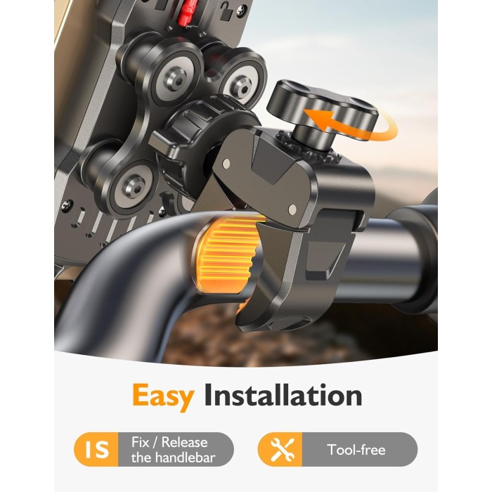 - [Tool-Free Installation] Rolgno motorbike phone mount features an open-clamp design that makes installation a breeze — just twist the knob to tighten, no tools needed. Works seamlessly on bikes, motorcycles, scooters, e-bikes, and ATVs, fitting handlebars from 0.7" to 1.5" (18-39mm) in diameter. Swap between vehicles in seconds.