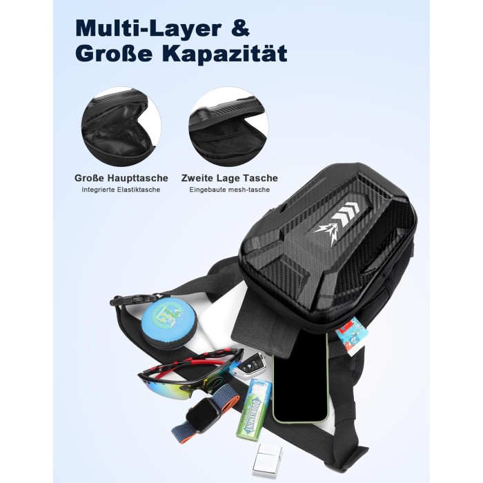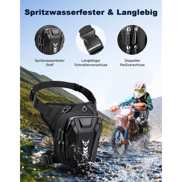 - 【Premium & Langlebiges Material】Die Beintasche ist aus hochwertigem EVA-Hartschalenmaterial mit Carbonfiber-Textur für hervorragenden Halt, Schlagfestigkeit und Kratzfestigkeit. Der robuste, versiegelte Reißverschluss schützt Ihre Wertsachen vor Spritzwasser und hält sie trocken und sicher. Inspiriert von eleganter Mecha-Ästhetik besitzt die Motorrad Tasche ein futuristisches Design, das Ihren individuellen Stil unterstreicht.
