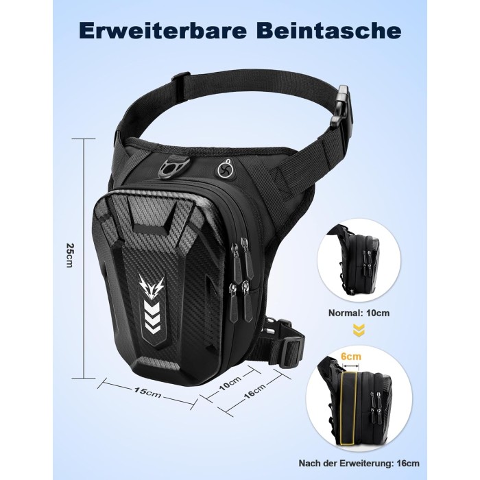 - 【Erweiterte Großraumkapazität】 Die Motorrad Beintasche Herren verfügt über 2 Reißverschlusstaschen, mit einer elastischen Tasche in der Haupttasche und einer Netztasche in der Nebentasche. Die Motorrad Beintasche auch eine 6cm Platzausweitung für die Haupttasche, um ausreichend Stauraum für Smartphones, Geldbörsen, Wasserflaschen, Regenjacken, taktische Taschenlampen und Erste-Hilfe-Artikel bereitzustellen.