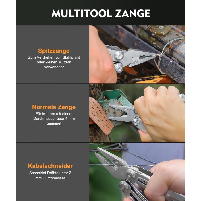 - 【14 IN 1】 Die Rolgno Multitool Messer verfügt über 14 verschiedene Funktionen: Spitzzange, Normale Zange, Kabelschneider, Messer, Datei, Schlitzschraubendreher, Flaschenöffner, Dosenöffner, Abisolierzange, Säge, Kreuzschlitzschraubendreher, Schlüsselbund, Brieföffner. Dank seines vielseitigen Designs müssen Sie nicht mehrere Werkzeuge gleichzeitig tragen.