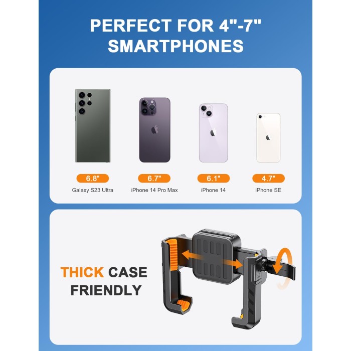- [FITS 4.7”-7” SMARTPHONES] Our easy-to-install phone holder for motorbike is compatible with a wide range of phones ranging from 4.7-7 inches. With four-corner silicone padding inside the mount, it ensures a secure and tight grip, without causing any damage to your phone. (Attention: the maximum thickness the phone clip can hold is 0.62"/16mm.)
